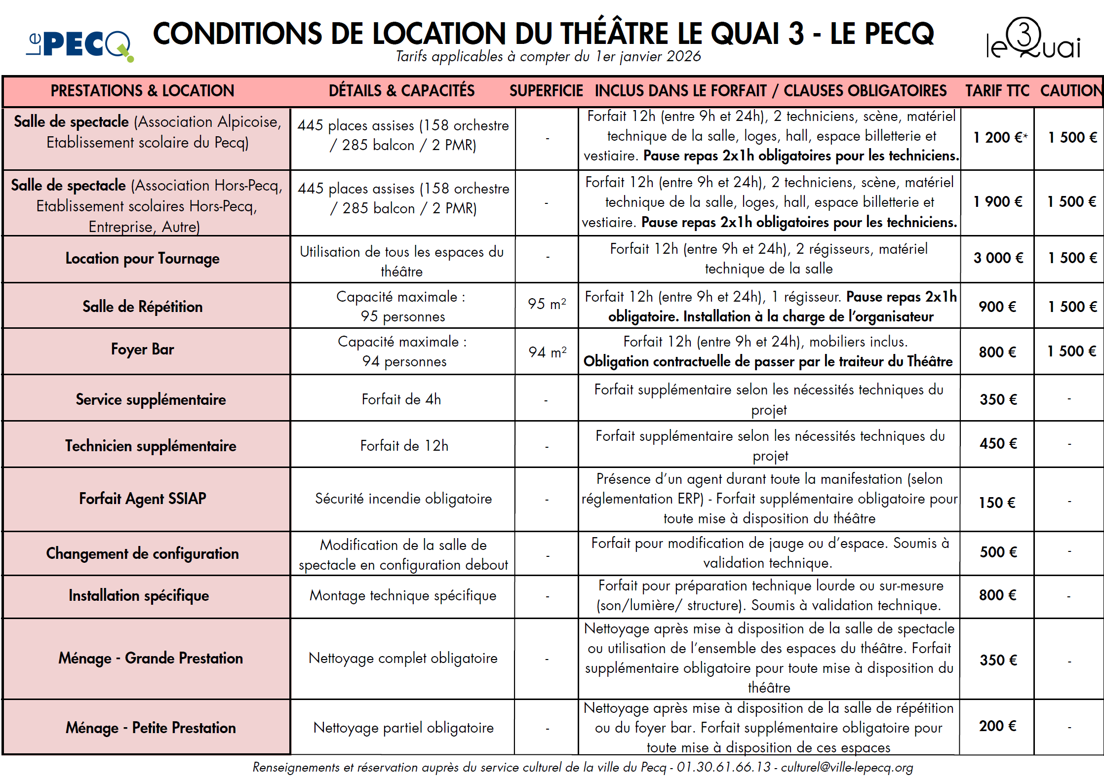 Pour les tarifs de location de la salle, merci de vous référer au document Tarifs et détails des salles du Pecq à louer – 2026